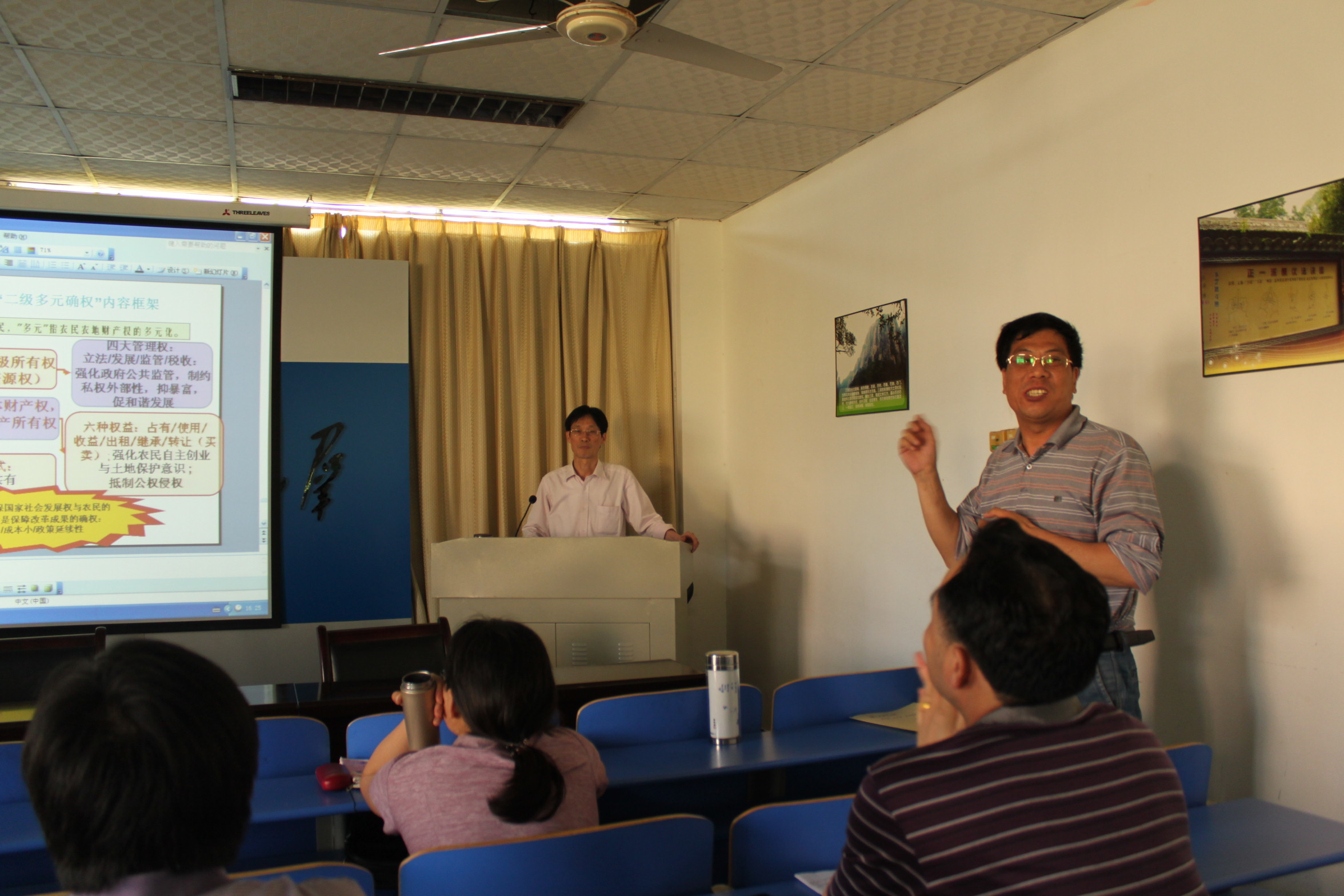2012年5月17日下午,题为“‘共产’到‘确权’:近百年农村财产权制度改革的马克思主义中国化”的学术讲座,在马克思主义学院会议室举行。讲座由学院首席教授温锐主讲,学院副院长黄欣荣教授主持,学院四十余名老师参加。