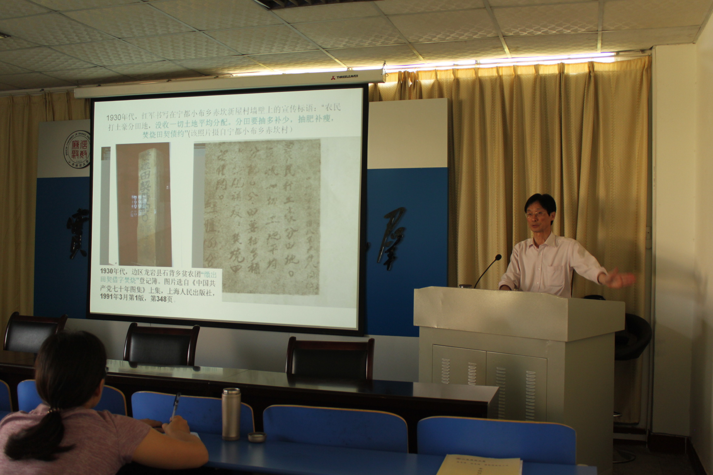 温教授的报告引起在场教师的强烈共鸣。大家全神贯注,现场气氛热烈;老师们纷纷就关心的问题提问,温锐教授一一作答,并与大家进行了深入探讨。老师们感叹:温教授的研究,从农村财产权改革史入手,图文并茂,以“共产到确权”五字,全面展示了马克思主义中国化那有血有肉、丰富多彩、跌宕起伏的历史画卷;科学研究,注重文献研读,深入田野调查,不兴空话,不用套话,论从史出,为我们真实而非空洞地探讨与准确认识马克思主义中国化问题提供了一个全新的视角。学术报告取得圆满成功。