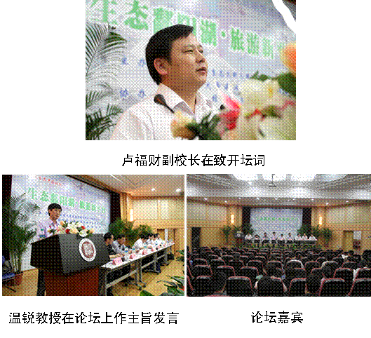 我校副校长卢福财作了热情洋溢、极具启发与学理意味的开坛致辞,并参加了论坛的交流与对话。温锐教授作了《论生态鄱阳湖建设与江西旅游发展新突围》的主题报告,他立于鄱阳湖生态经济区发展战略的全新平台,从重新认识鄱湖旅游资源、重新审视现有主题形象和驾驭鄱湖品牌与主题新形象三个方面,以鄱湖旅游品牌新崛起、“鄱湖山水,人杰地灵”和“聚湖实心”、“亲水融山”、“低碳旅游”等观点与思路,论证了江西旅游业应实现品牌亮点、主题形象、开发理念全新突围的观点。